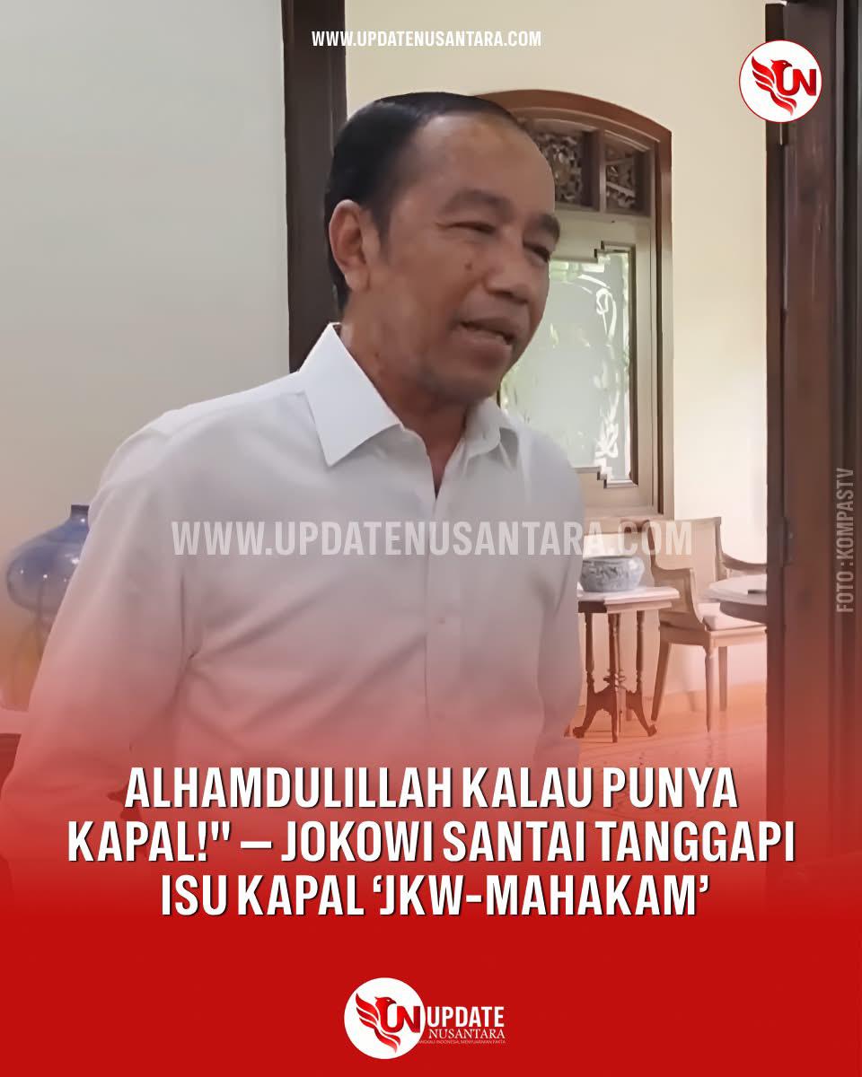 Menanggapi isu tersebut, Jokowi justru menanggapinya dengan santai. “Kalau ada tulisan JKW kemudian diartikan milik saya, ya senang banget saya. Alhamdulillah punya kapal,” ujarnya sambil tertawa, Jumat (13/6/2025).