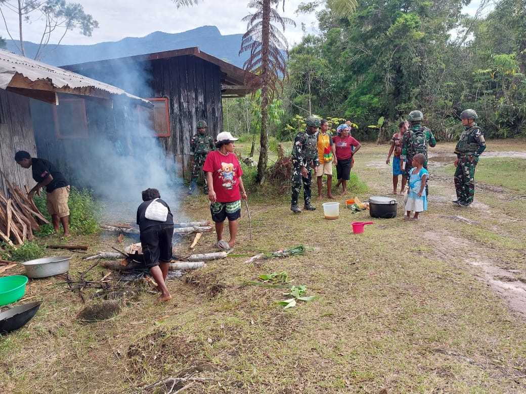 Personel Satgas Pamtas RI- PNG Kewilayahan Yonif 521/DY Binter terbatas melalui Anjangsana Masuk dapur Mama-mama Papua memberikan bantuan Sembako dan turut serta hadir membantu warga dalam menyiapkan perayaan ulang tahun Persekutuan Wanita (PW) Gereja Lacheroy Distrik Apalapsili Kabupaten Yalimo.